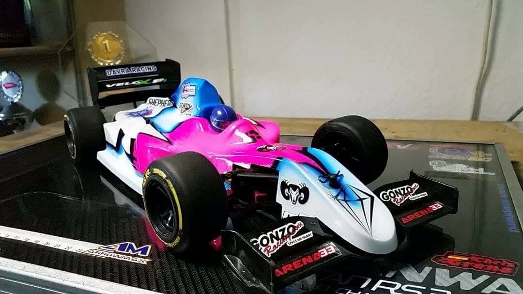 Abbiamo iniziato con la mitica Tamiya f104 X1 ( era praticamente l’unica F1Rc disponibile), con gomme in lattice Tamiya e motore Torke 17.5, per passare successivamente alle gomme Ride R1 e al motore Hobbiwing 21.5.