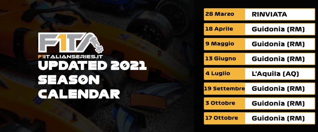Visto il nuovo decreto approvato oggi 22 Febbraio abbiamo deciso di spostare l’inizio del Campionato F1italianseries al 18 Aprile e di disputare tutti i GP sulla pista La Tartaruga di Guidonia ad eccezione dei GP del 4 Luglio che ci speriamo di poter correre a L’Aquila.